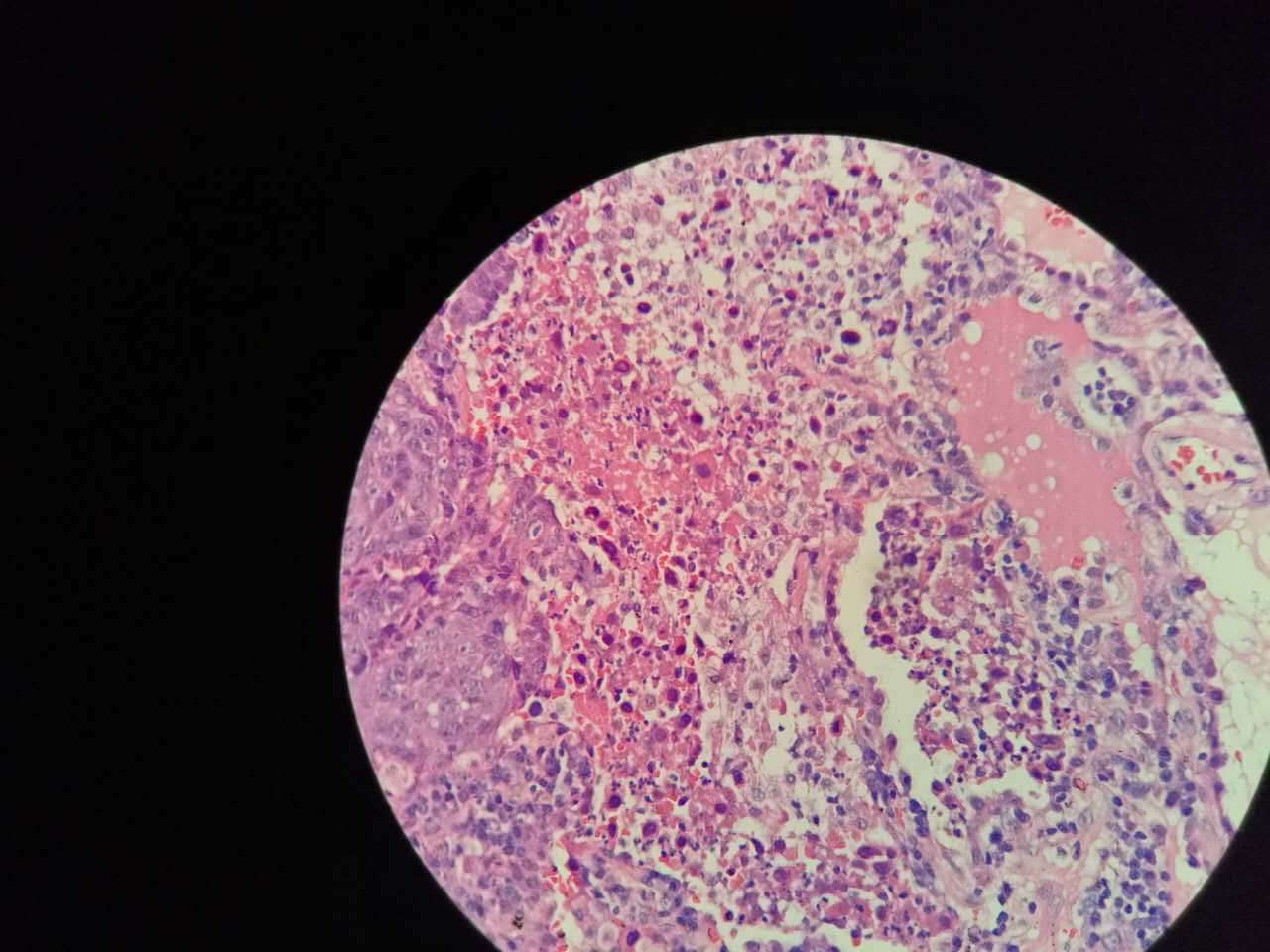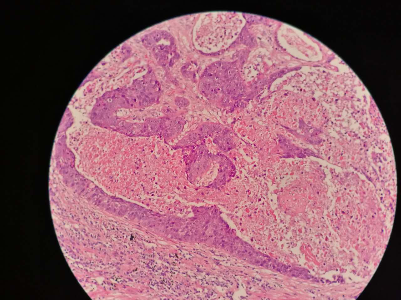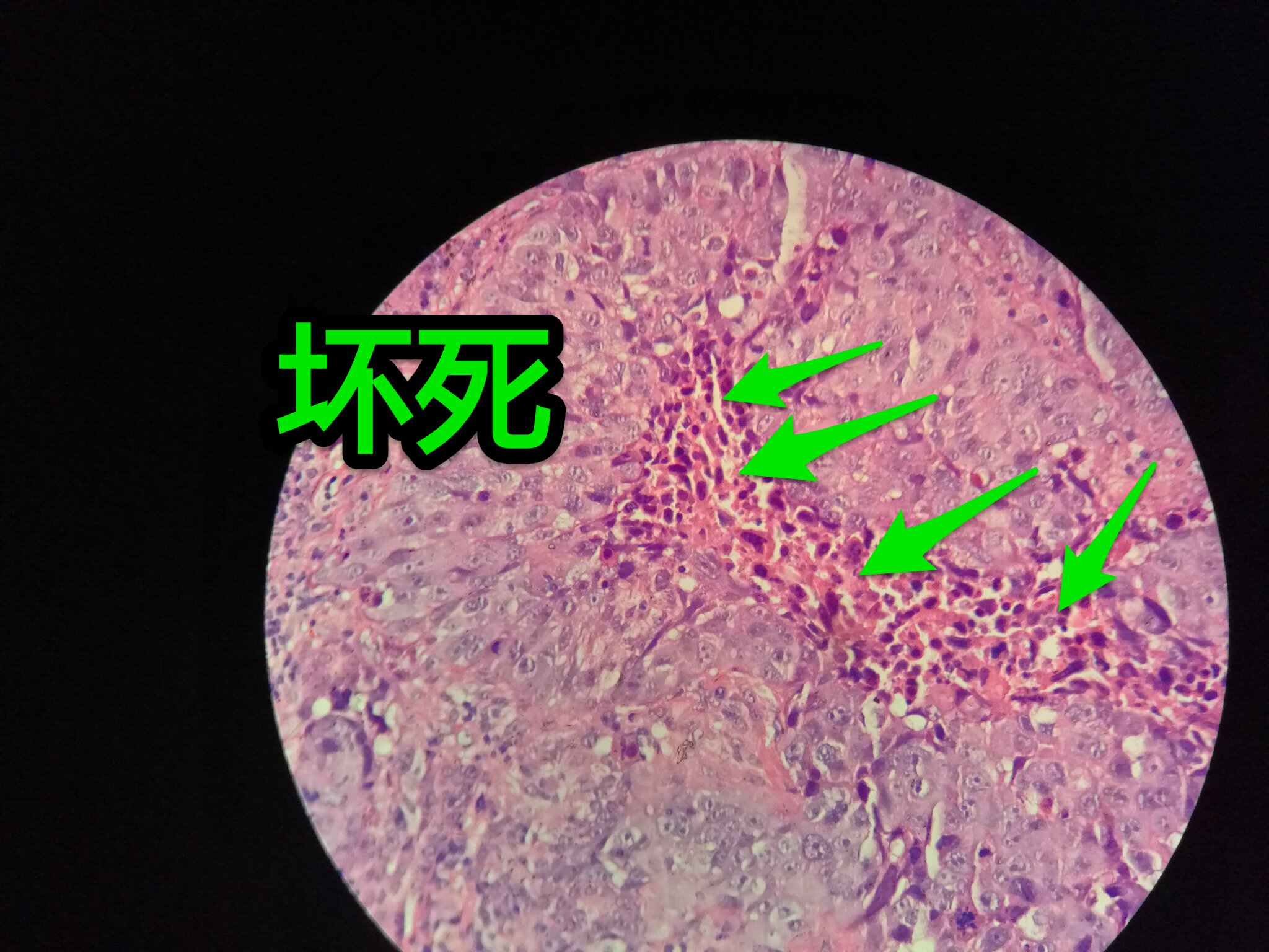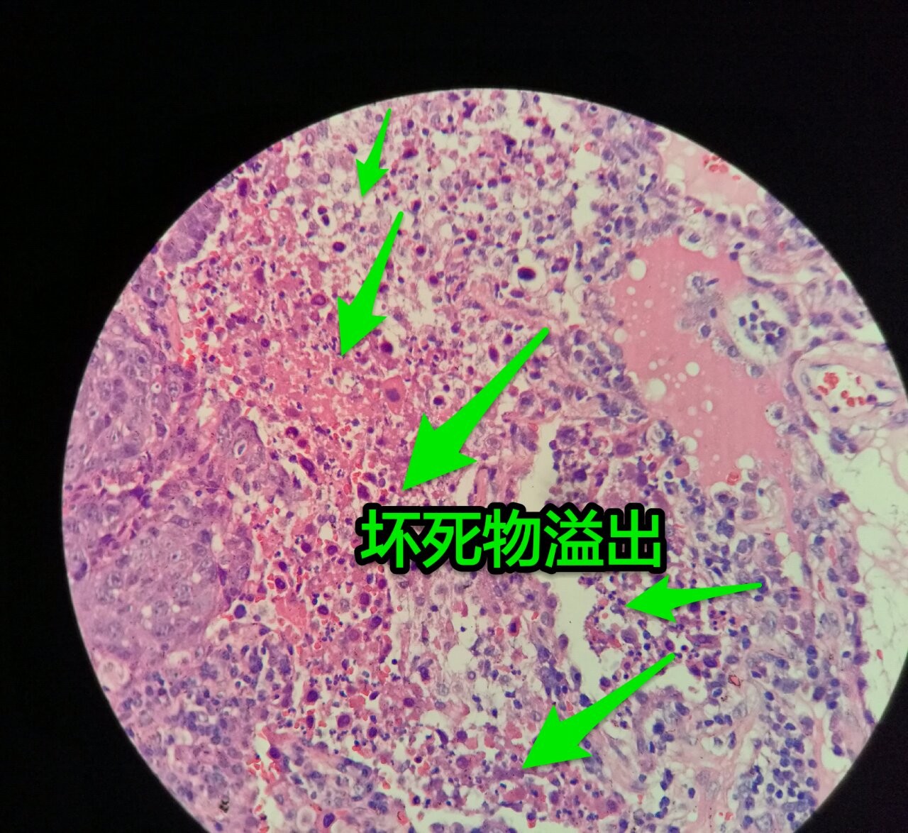 左手边有一点鳞癌,右手边有正常肺泡组织,中间有坏死物,这是为什么呢?