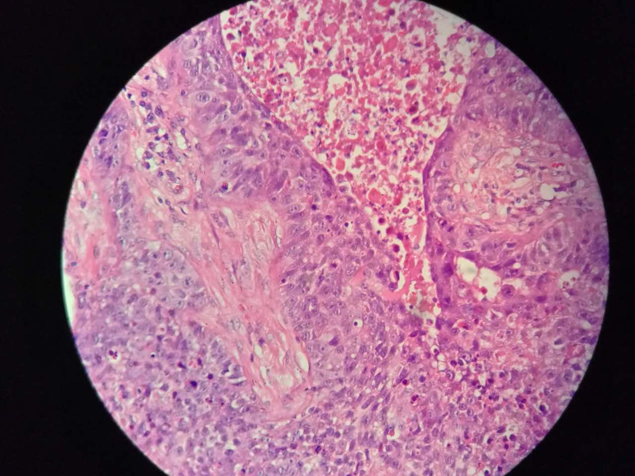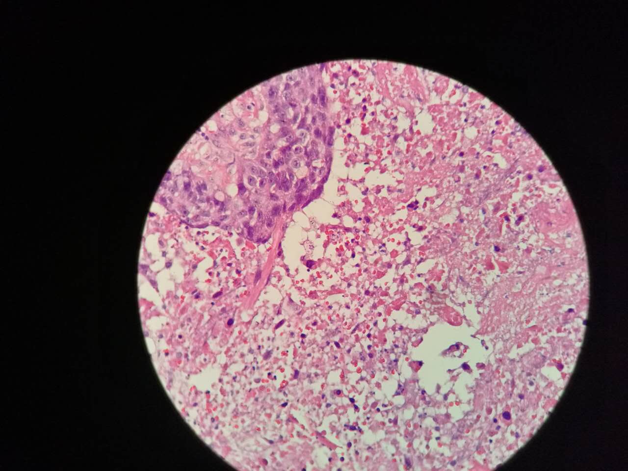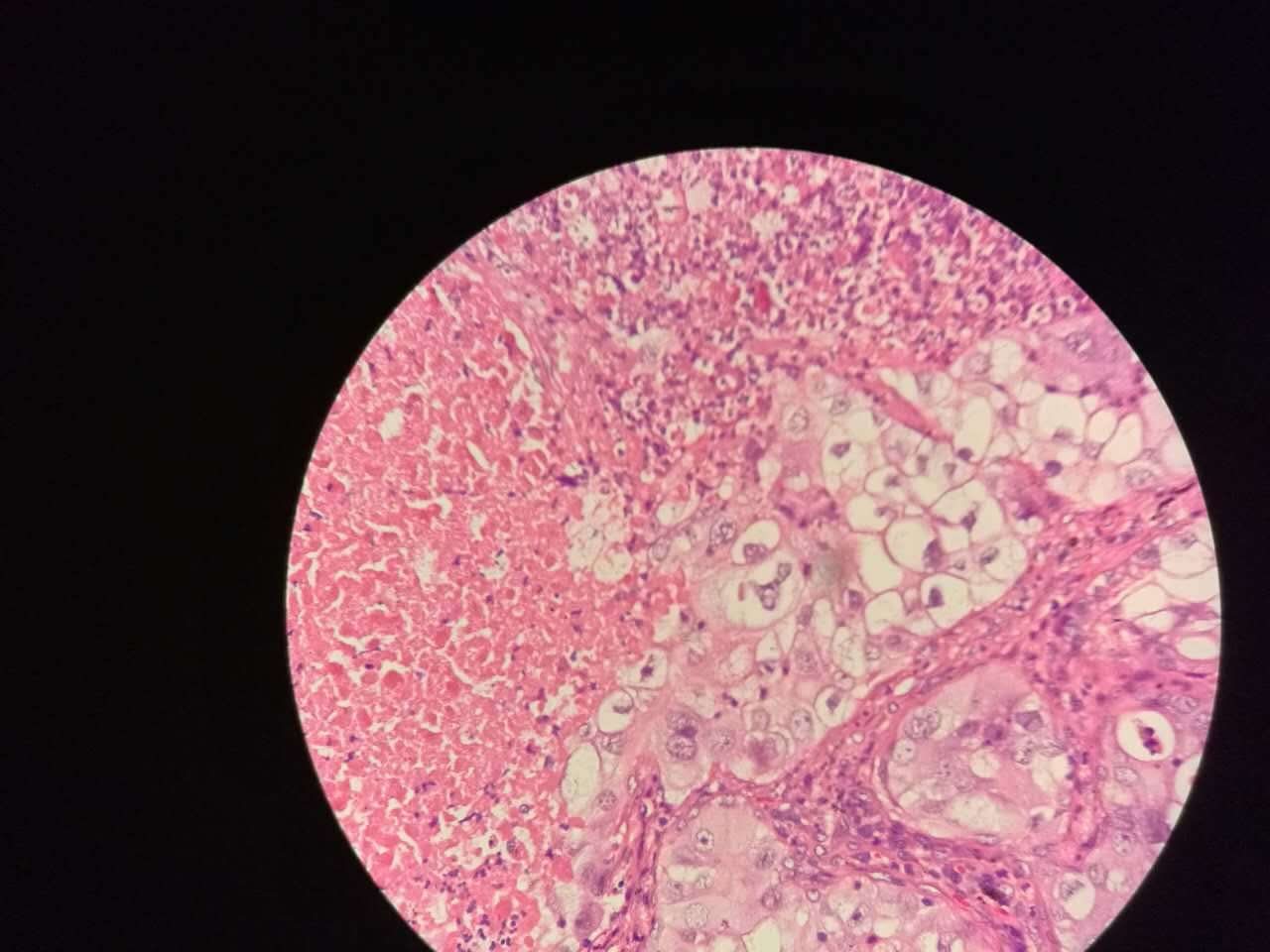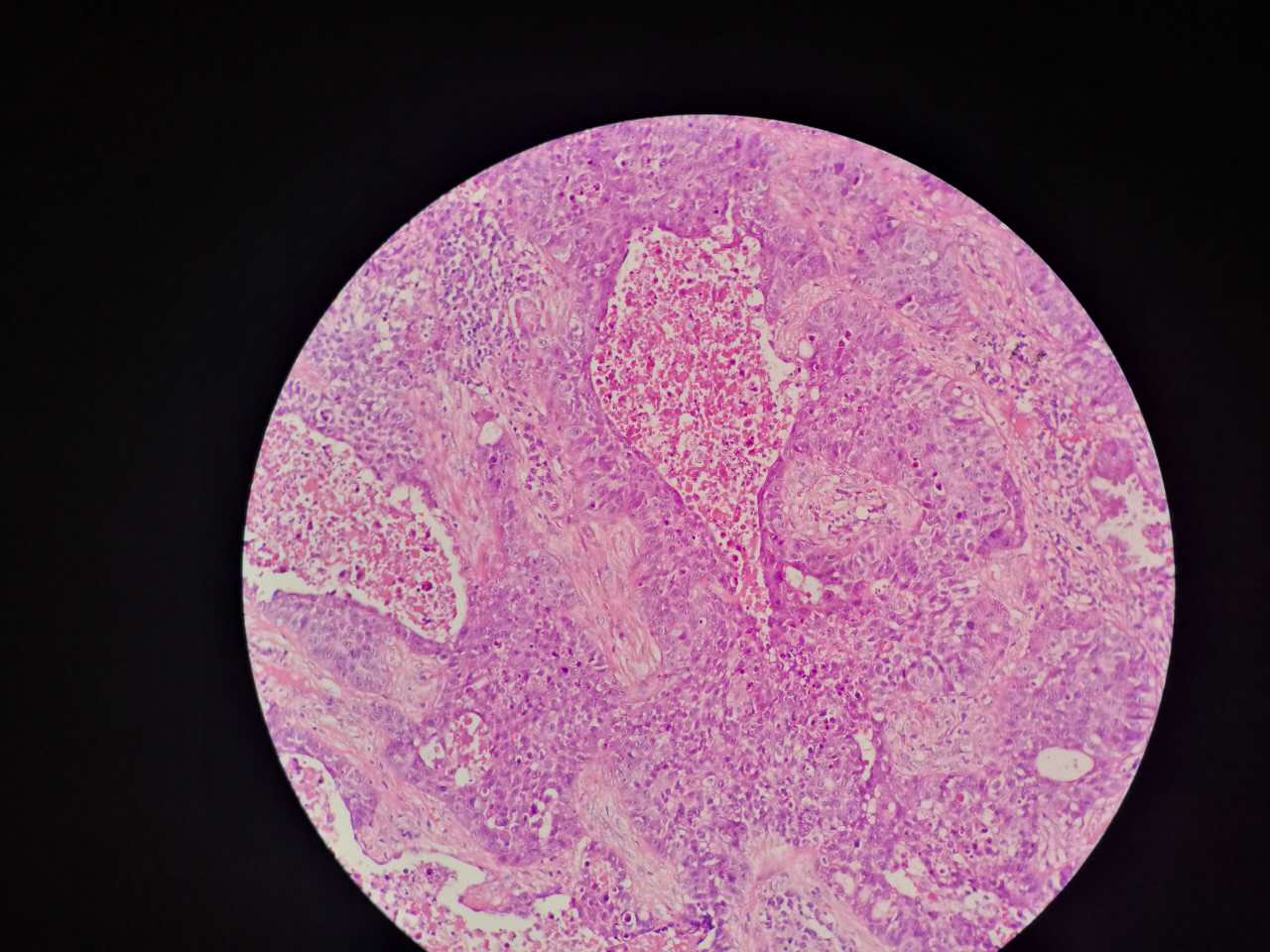 左手边有一点鳞癌,右手边有正常肺泡组织,中间有坏死物,这是为什么呢?