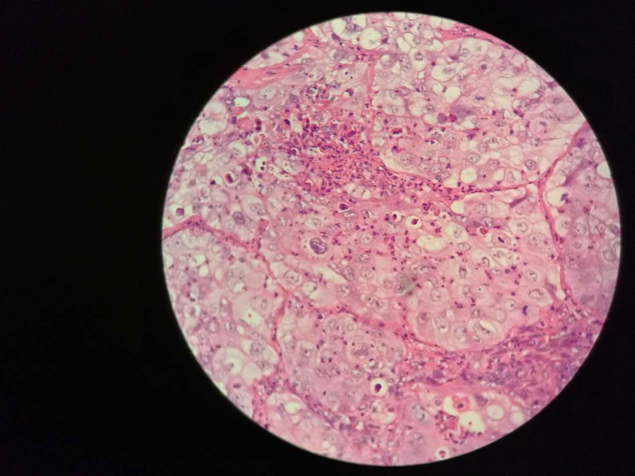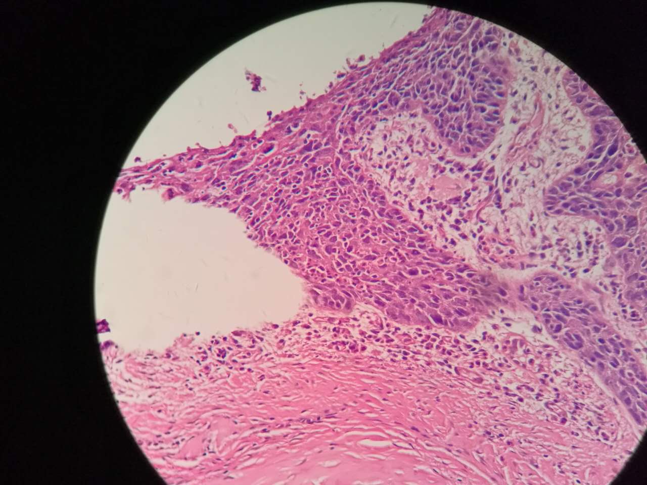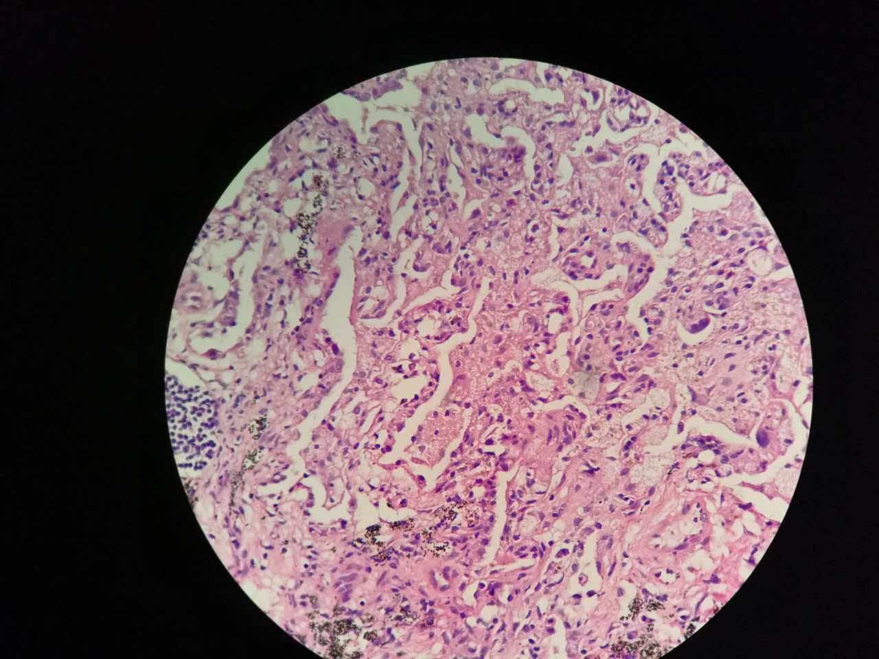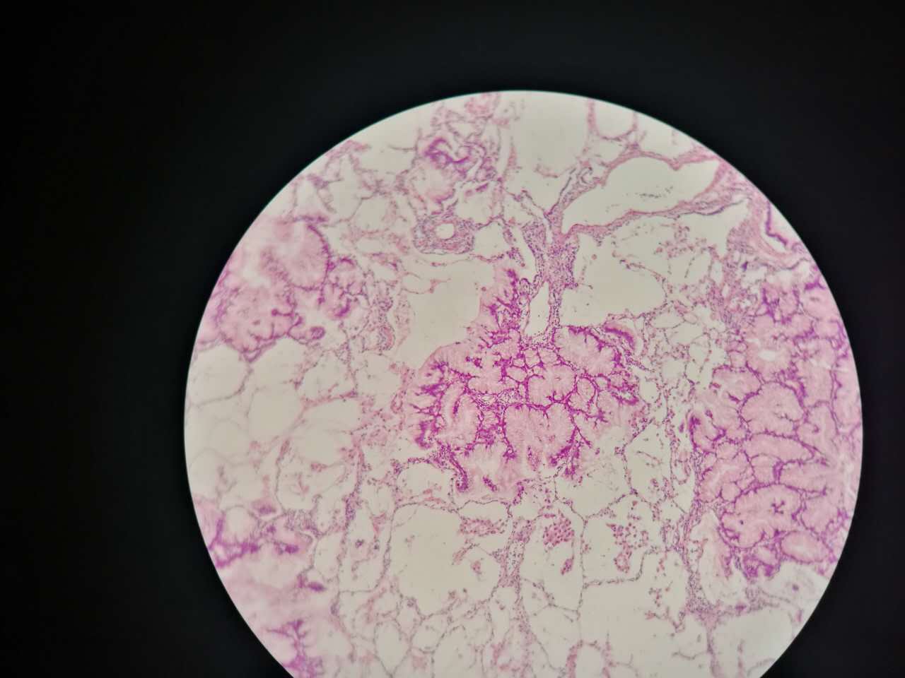 左手边有一点鳞癌,右手边有正常肺泡组织,中间有坏死物,这是为什么呢?