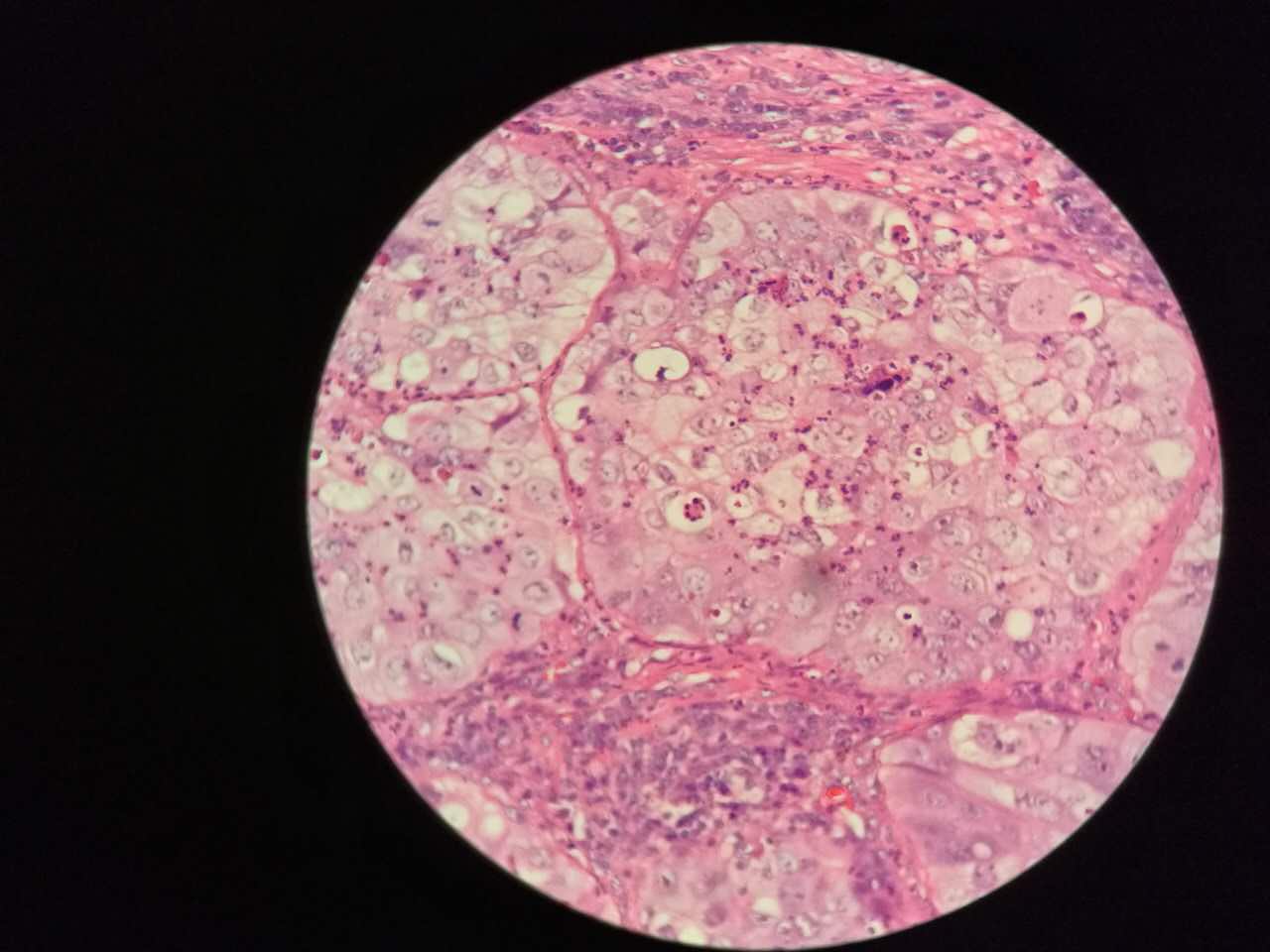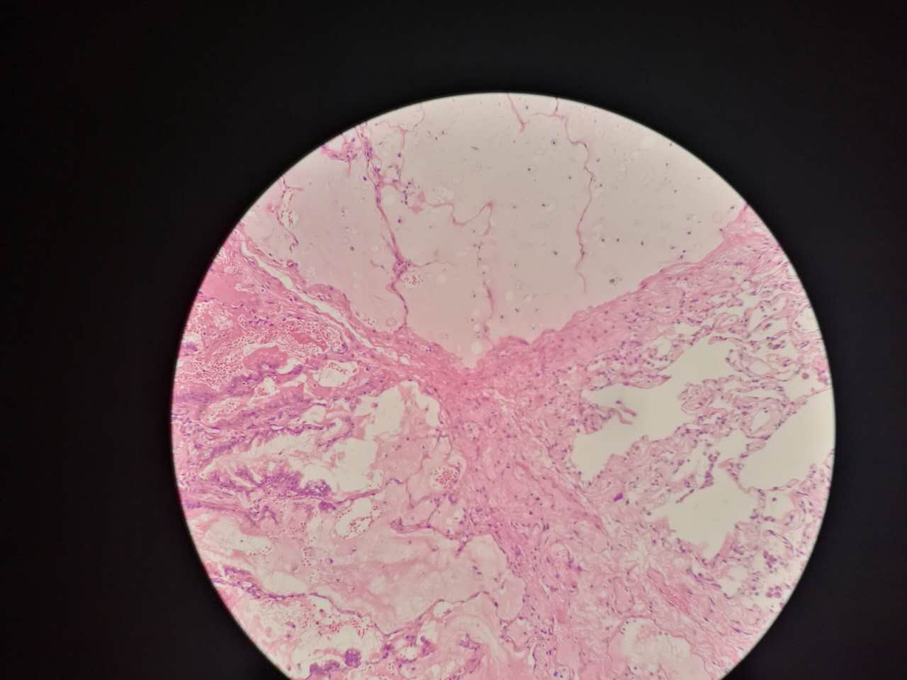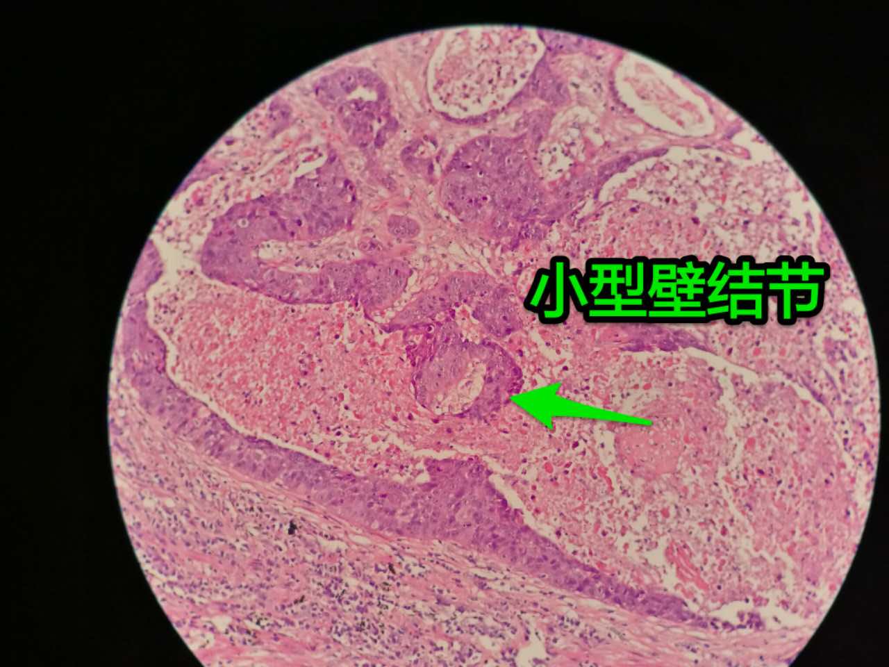 这个中央那块也算是小型的壁结节,肿瘤组织突入坏死区。或者说,这块肿瘤组织没坏死。