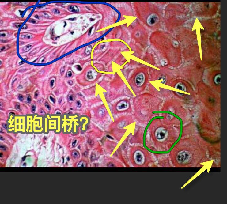 连晓峰:细胞间桥我理解为鳞状细胞之间像小梯子一样的结构,把各个鳞状细胞之间连接起来,鳞癌恶性程度越高,细胞间桥越少。有时候细胞形态不好区分,又没有角化珠,就得看细胞间桥来鉴别。不知道是不是这样理解,王老师@王兆宇 细胞间桥是鳞状细胞️高分化鳞癌、角化型鳞癌的特有结构吗?其它组织都没有吗? 王娟红:高分化,中分化鳞癌有,其他无,是鳞癌特有的